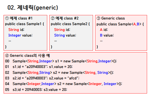 ③ class 이름 뒤에 가 있음을 유의해 보라. Sample class 내에서 사용되는 두 가지 타입 A와 B에 대해 사용자가 임의로 지정할 수 있도록 해주겠다는 의미이다. 또한 멤버 변수 id는 A 타입으로, value는 B 타입으로 선언되었다. id는 사용자가 지정한 타입 A로 생성하고, value는 사용자가 지정한 타입 B로 생성한다는 의미이다.