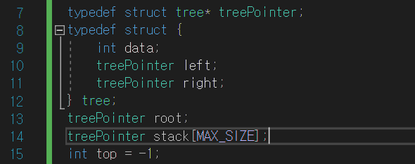 - 구조체 포인터를 선언할 때는 포인터 변수이기 때문에 *를 붙여줍니다. 하지만 저는 구조체 포인터를 typedef tree* treePointer라고 재정의 해줬기 때문에 treePointer ptr 라고 선언할 수 있는 겁니다.